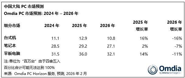 Omdia高级分析师徐颖(Emma Xu) 表示:“2025年,推动PC需求增长的补贴政策在 2026 年已开始调整。整体补贴力度已从去年的约30%收窄至约15%。此外,更严格的执行方式,例如省级配额以及分阶段发放补贴,也将限制需求在单一季度内集中释放。与此同时,2025年大规模补贴已经提前透支了部分需求,在零部件成本上升以及整体材料成本通胀的背景下,2026年要实现持续增长将更加困难。多重因素叠加,将使2026年成为中国PC市场及其整个生态体系都面临挑战的一年。”